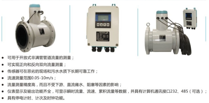 非滿管流量計顯示及輸出功能齊全,可顯示瞬時流量、流速、累積流量等數據,并具有計算機通訊接口232485(選配件);