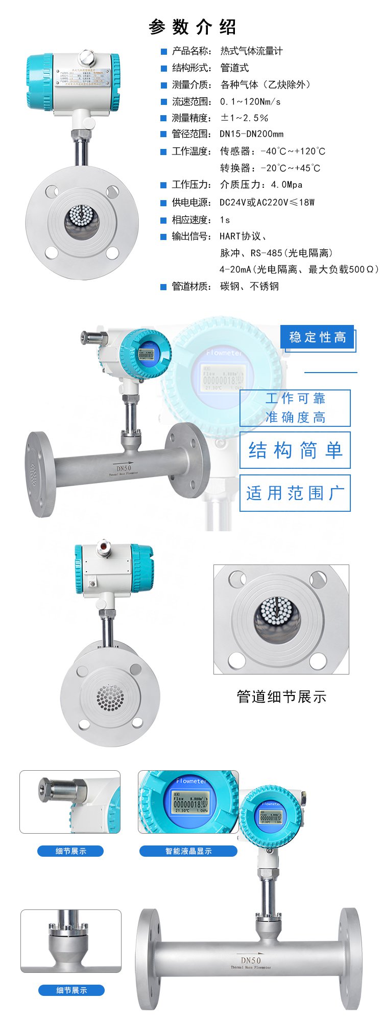 熱式氣體質量流量計是利用熱擴散原理測量氣體流量的儀表。傳感器由兩個基準級熱電阻(RTD)組成。一個是速度傳感器RH,一個是測量氣體溫度變化的溫度傳感器 RMG。當這兩個RTD置于被測氣體中時,其中傳感器RH被加熱,另一個傳感器RMG 用于感應被測氣體溫度。隨著氣體流速的增加,氣流帶走更多熱量,傳感器RH的溫度下降。