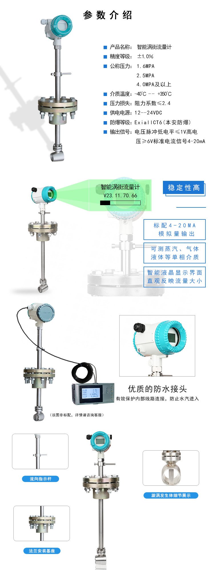 采用埋入壓電晶體的渦街測速探頭,插入大口徑工業管道內,將卡門旋渦頻率轉換為與流量成正比的電流或電壓脈沖信號或4~20mA電流信號。