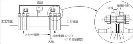 2、電磁流量計安裝在具備陰極掩護的金屬管道上,安裝時用≥6mm2銅線將管道與管道相銜接,用≥4mm2銅線將接地法蘭(接地環(huán))與電磁流量計相銜接,接地線從電磁流量計法蘭上接入接地網(wǎng)。